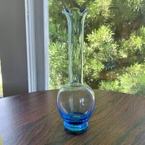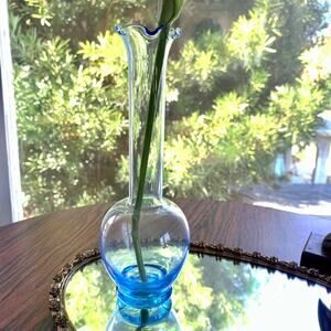This vintage light blue glass bud vase adds a gentle pop of color and charm to any space. Featuring a scalloped edge and graceful silhouette, it's perfect for holding a single bloom or small bouquet. The soft blue hue and vintage design make it a lovely accent for cottagecore, shabby chic, or mid-century modern décor. A sweet addition to a windowsill, shelf, or tabletop.