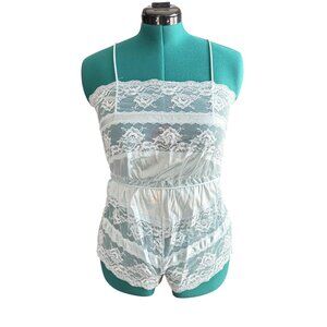 This elegant lingerie set combines comfort and sophistication, featuring a lace-trimmed romper and a satin robe. Designed for a luxurious and timeless appeal. Russell Newman Texsheen Romper and Cinema Etoile Robe.