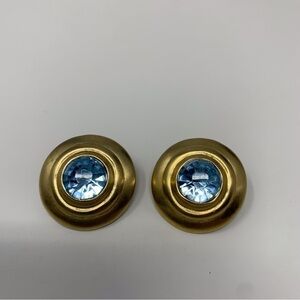 Vintage Light Blue Sparkle Stone with Gold Tone Circle Border Stud Earrings