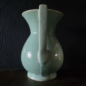 This vintage pitcher offers a timeless design with its flared rim and unique light green glaze. Marked #548, it blends functionality with decorative appeal.