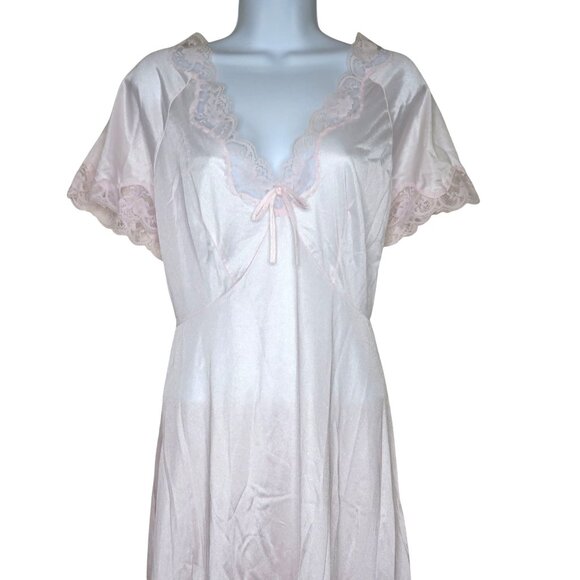 Elegant vintage light pink nightgown with lace trim. Features a tie-back for a flattering fit. Perfect for adding a touch of retro glamour to your sleepwear collection.