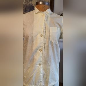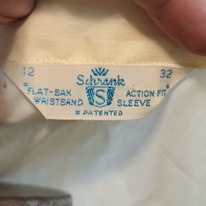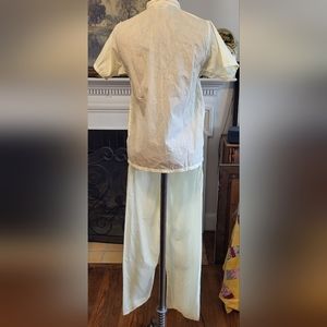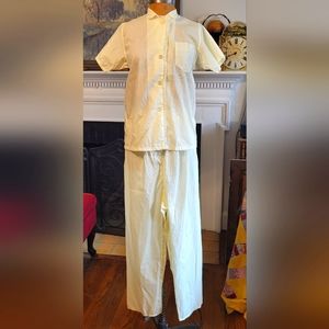 Vintage Light Yellow Schrank 2 PC Pajama Set. Nice little Set with shirt top and pants. Light Yellow with a little white lace trim. Has a few little spots as show. 2 areas in pants and one area behind collar.