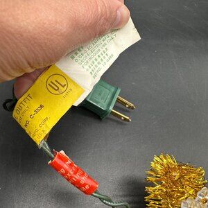 The back has a bread tie to attach it to the tree. Three light bulbs are out and need replaced.