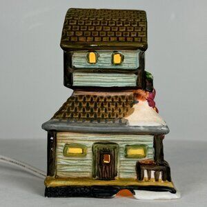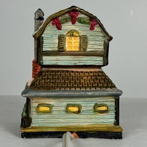 This hand-painted ceramic Christmas village "Flowers & Fruits" store adds a nostalgic charm to holiday décor. Its light-up feature creates a warm, inviting ambiance, perfect for a holiday village scene.