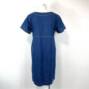 Calling all ladybug lovers! This adorable little blue denim shirt sleeve dress has little embroidered ladybug detail adorning scoop neckline. Basic, vintage 90s style dress is slightly fitted at bust and falls gently to just above knee length. Small slit at front and back hem. Lightweight denim feels like 100% cotton and has no stretch.