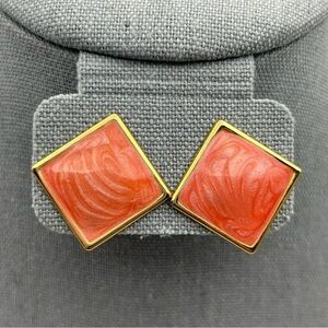 Vintage Lightweight Bright Coral Orange Swirl Stud Square Pierced Metal Earrings Gold Tone