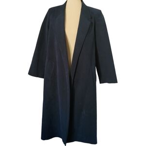 Excellent pre owned condition. Vintage - Lilli Ann Union Label Blue Ultra Suede Open Front Tie Waist Midi Coat. Shoulder pads. Collared. Two front pockets. Fully lined.