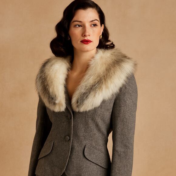 Vintage Lilli Ann Gray Wool Fox Fur Trimmed Blazer Jacket Skirt Suit S