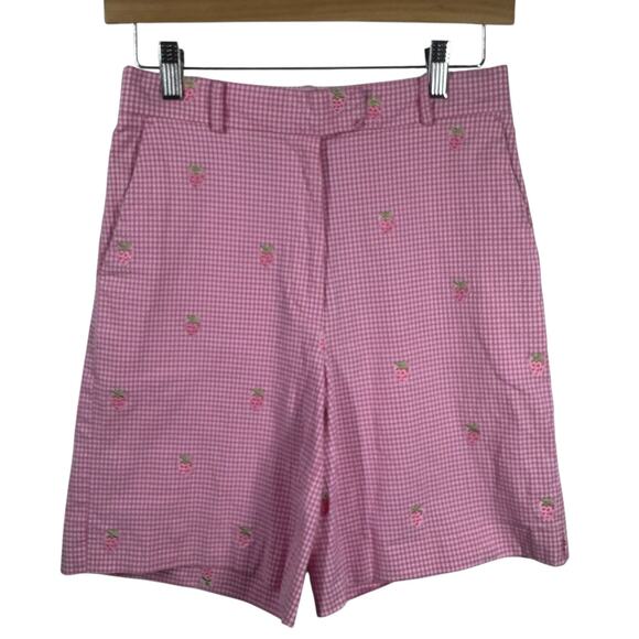 Vintage Lilly Pulitzer Short Women 2 Pink White Gingham Embroidered Strawberry Straight Leg Bermuda Clasp Closure