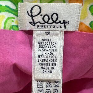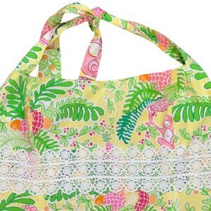 Vintage Lilly Pulitzer Vintage Yellow Paradise Square Neck Crop Halter Monkeys Lace 12. This halter is made of 65% Cotton 32% Nylon 3% Spandex. It measures across the front 18" Length 15". This halter features boning through the front, tie top and back zip. This halter is in excellent, used condition. There are no rips, tears, stains or damage. Ships from a Smoke Free Home. Any questions, please ask. All reasonable offers welcome.
