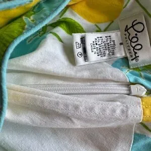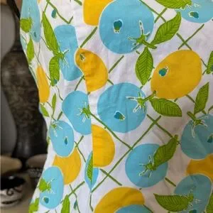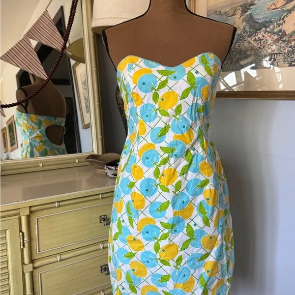 Strapless Lilly Pulitzer dress with bright lemon and blueberries allover print. Lightweight cotton fabric. Fitted, feminine silhouette. Playful green leaf accents throughout.
