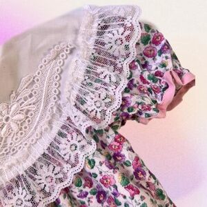 This amazingly structured dress is ready to twirl the day away with it's multiple layers of skirting underneath a pink and purple floral top piece with large lace lined collar, pink rosette and winged floral appliqué. From Lilo California.Size 24mo. W 12 in. X L 14.5 in. Tagged/ Branded: Lilo California. U.S.A Vintage Character: Mint Vintage Condition