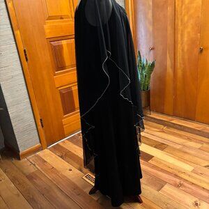 1960's-1970's this beautiful dress was designed by Lily Lynn who specialized in designing attractive, quality, feminine and sexy clothing for larger women. This is a size 18 and I apologize that I can't give you exact measurements as it is a Kaftan style dress designed to fit loosely. The sheer overlay drapes beautifully. I'm not sure what I think of the flower in the front but it could easily be removed. With the exception of the tattered tag, this dress is in excellent condition. It has been dry cleaned and is ready for your special occasion.