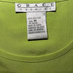Amazing super soft 100% silk lime green tank top/shell with slits on the side. Brand is Grace Chemise. Perfect for layering or wearing by itself. Women's size medium, see measurements below.