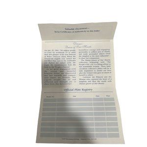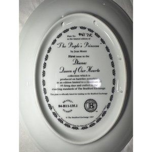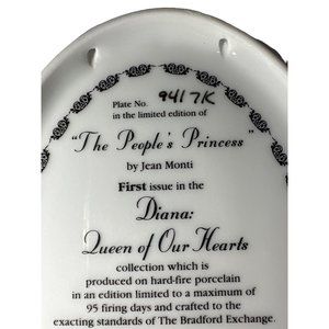 1997 The People’s Princess Diana Collectors Plate. Queen of our hearts Bradford. Plate # 9471k beautifully painted by Jean Monti the Artist. This plate is officially Listed for Trading on the Bradford Exchange. collection which is produced on hard-fire porcelain in an edition limited to a maximum of