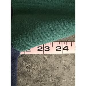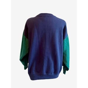 Color: Navy body with green colorblock sleeves; rib-knit collar, cuffs, and hem