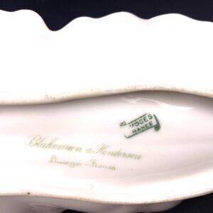 This elegant antique leaf-shaped porcelain tray was produced in Limoges, France, between 1900 and 1915 by the renowned Tressemanes & Vogt (T&V) and hand-decorated or distributed by Blakeman & Henderson. It features a beautifully scalloped and gilded edge, intricate floral and scroll border designs in green and rust-orange, and a fine gold medallion in the center. A truly striking display or serving piece from the golden era of Limoges porcelain.Made of fine bone china, this tray features a white base with intricate gold, rust, green, and beige accents, showcasing the exquisite craftsmanship of the time period. Measuring 10.75 inches in length and 3.75 inches in width, this vintage original piece is not only functional but also serves as a decorative and collectible item for those who appreciate fine porcelain artistry.Excellent antique condition with minor wear to gold consistent with age. No chips or cracks. Please refer to photos for detailed condition.Perfect For:Collectors of Limoges porcelain, vintage French decor, elegant vanity trays, or unique antique serving pieces.