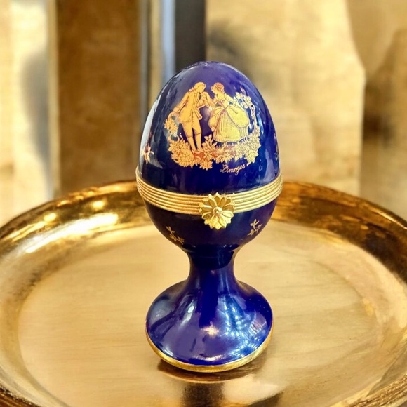 VINTAGE Limoges Peint Main Cobalt Blue Porcelain Pedestal Egg Courting Scene Hinged Trinket Box, France
