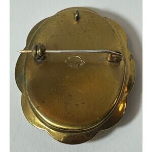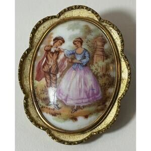 This vintage Limoges porcelain brooch pendant features a beautifully hand-painted romantic scene signed Fragonard, a nod to the 18th-century French artist famed for his Rococo courtship themes. The oval porcelain cabochon is set in a detailed gold-tone frame with scalloped edges, and the back is stamped Limoges France. Measuring approximately 2" wide, this versatile piece can be worn as both a brooch and a pendant, making it a charming addition to any jewelry collection.
