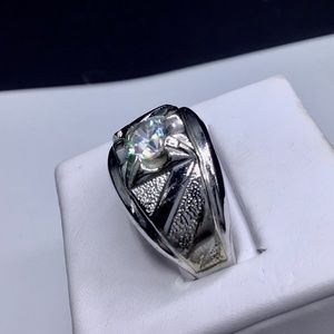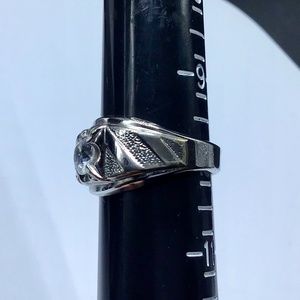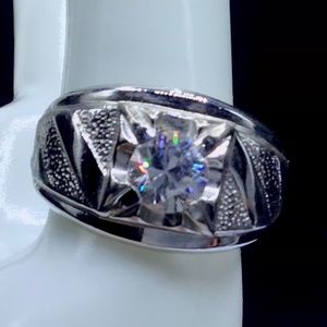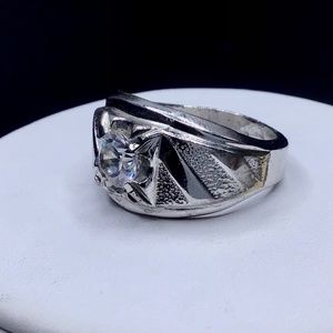 Vintage Lind 14KT white GE ring with a large cubic zirconia. This unisex ring has a wide ring shank with a textured striped design. It has a large prong set sparkly CZ in the center. It is between a size 9.75-10 and stamped, 14K TH GE or GL Lind” on the inside of the band. Some minor wear. Please refer to photos.