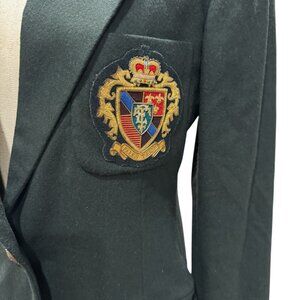 Classic 1990s Linda Allard for Ellen Tracy velvet blazer in deep forest green. Tailored single-button silhouette with notch lapels, welt pockets, and a gold-embroidered crest patch at the chest—perfect for preppy / dark-academia / equestrian styling. Fully lined; luxe hand and elegant drape.