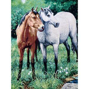 Description: This is a genuine Vintage Linda Picken Horse Equestrian Wall Tapestry. No rips, tears, marks, stains, flaws or defects. The tapestry features pictures of horses, black color border, soft polyester with cotton and acrylic blend fabric, imported.