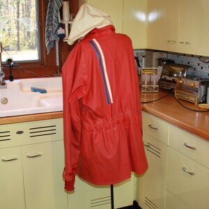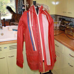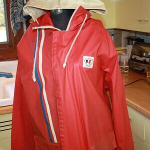 This is a Line 7 raincoat. It was made in New Zealand. It has a hood that will snap down when you roll it up. It is very waterproof, and it is tough to clean. It is marked as size L and is about 33 inches long and 24 inches pit to pit. There is some stains and rubs that did not clean off with the quick wash I did on it. The Velcro on the front has collected some things over the years.