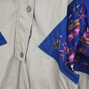 Step into retro country club vibes with this vintage Line-Up golf-themed windbreaker jacket. Features a khaki cotton shell with bold navy and jewel-tone print panels showcasing golf clubs, balls, tees, and ribbons — pure 80s/90s preppy energy. Full zip front with snap overlay, elastic hem and cuffs, and a drawstring collar for that classic oversized windbreaker silhouette.