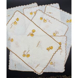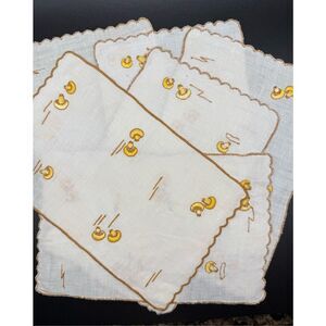 Vintage linen cocktail napkins. Mushrooms embroidered all over. White napkin, gold/yellow mushrooms. 1960’s.