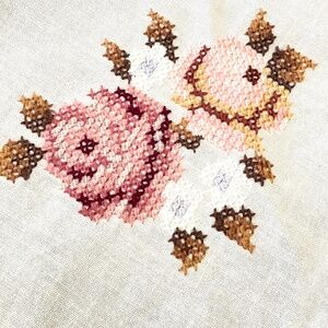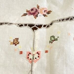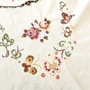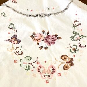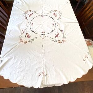 Vintage off white cotton linen oval tablecloth embroidered cross stitched in a roses and butterflies design measuring about 64" x 65". Center design with additional embroidery on the scalloped border. NOTE: there are 2 small spots -- see photos. Pre-owned. Smoke free and pet free home.