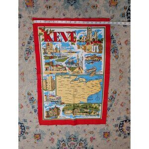 A linen tea towel featuring scenes and landmarks from Kent. There is a small mark in the top border as shown in pictures, but otherwise in like-new condition.