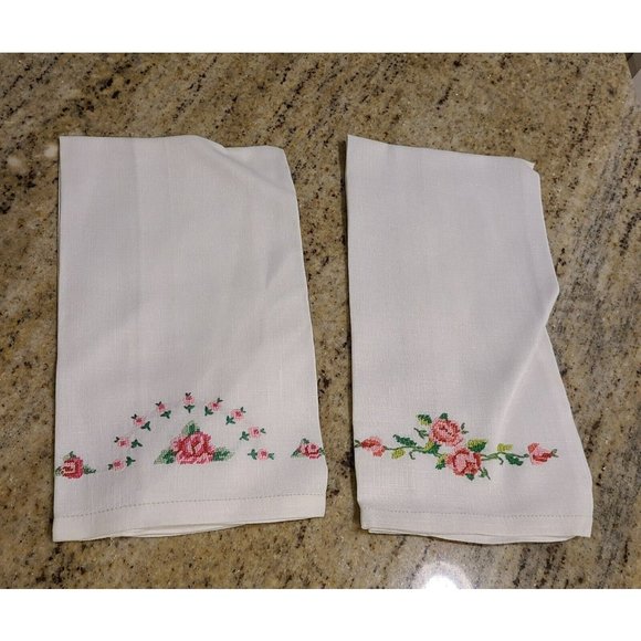 Vintage Linen Tea Towels Printed Needlepoint Pink Roses & Foliage. Set of 2