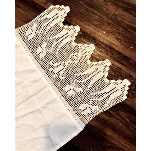 Beautiful vintage white linen with wide handmade filet crochet lace edging. The lace features a charming geometric floral motif with scalloped points along the edge. Likely dates from the early to mid 20th century and would make a lovely addition to a vintage textile collection, or for repurposing in sewing, décor, or crafts.