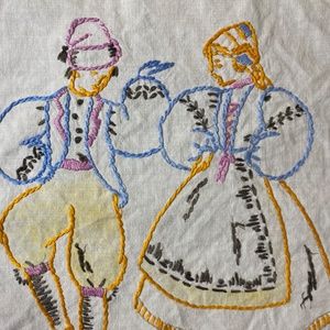 Vintage Linens Handmade Embroidered Dancing Couple Folk Art Table Scarf Hankie