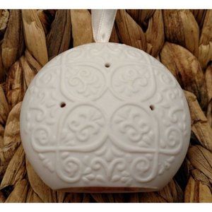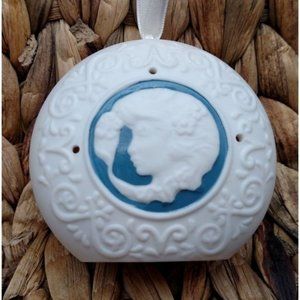 Vintage Coty Sweet Earth Cameo Pomander, EUC. 2.75" Diameter x 1.5" Deep. NO Chips, Cracks or Scratches. This is a white bisque porcelain pomander with a blue cameo on the front and has a white satin ribbon hander. It is very clean on the outside and looks like it has never been used. There is a scent pellet inside that still has a faint smell to it. You could use any potpourri or other scent you would like inside. Shipped w/ USPS Mail.