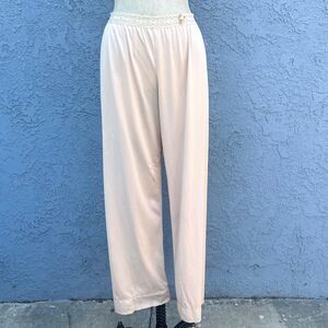 Vintage lingerie pajama pants. Beige cream pant liner with lace detail and bow. SIze large. Elastic in waist. Nylon. In good shape with light age in fabric.