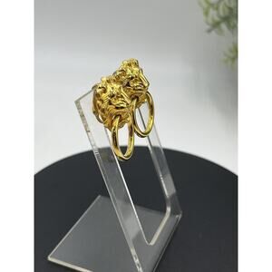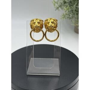 Vintage Lion Head Door Knocker Gold Tone Clip On Dangle Animal Earrings