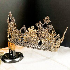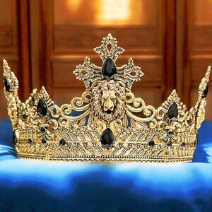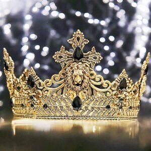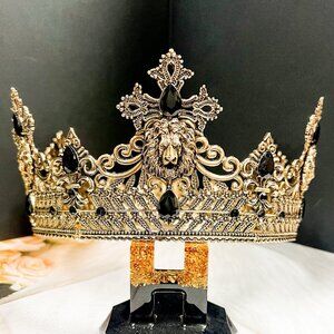 Vintage Lion King Crown, Black Crystal Crown for Groom, Prom Crown, Gold Crown