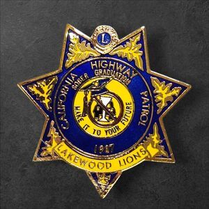 1967 Lakewood Lions / California Highway Patrol Sober Graduation badge, star-shaped design, bold blue & gold enamel, promotes CHPs sober grad campaign.