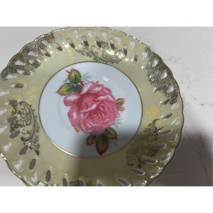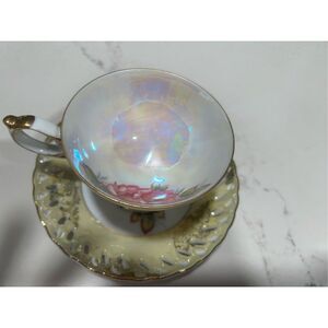 Design: Pink cabbage roses, gold trim, and iridescent lusterware.