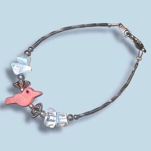 Vintage Liquid Silver Red Mop Carved Bird Bead Bracelet