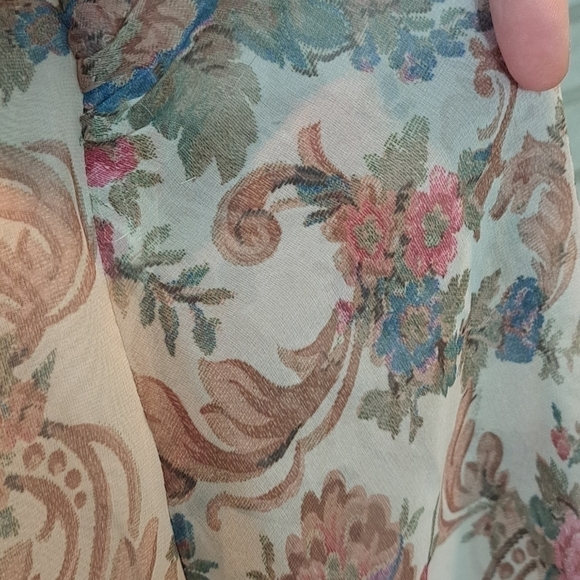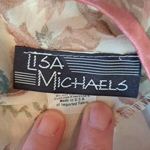 Vintage Lisa Michaels 80's Style Floral Peint Day Dress Long sheer sleeves with delicate buttons on cuffs Sheer puff sleeves Lined Made in USA From 100% polyester Buttons in back Size 14 See pictures for lay flat measurements Approximate measurements armpit to armpit 19 inches Shoulder to shoulder 16 waist 13 and shoulder to hem 45 inches Vintage runs smaller Has shoulder pads No rips stains or holes No belt Gardencore Grandmacore Cottagecore coquette Cottagecore Prairie Wedding Guest Pale floral colors