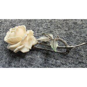 This vintage Lisa brooch is crafted with a stunning ivory-colored rose and detailed silver-tone leaves. A timeless design featuring floral accents, it measures approximately 3.25 inches in length.