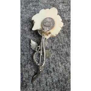 Vintage Lisa Silver Tone Ivory Rose Brooch Pin Floral Leaf Design Elegant
