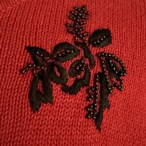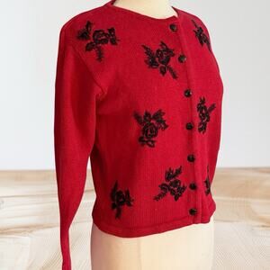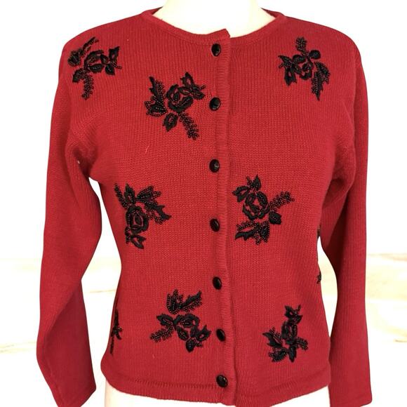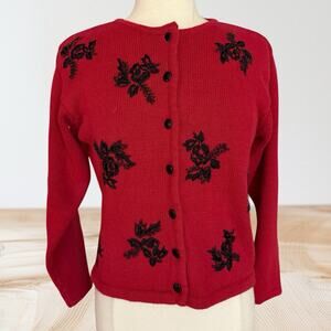Vintage Lise J Cardigan Sweater Sz S Cardinal Red Black Embroidery and Beading