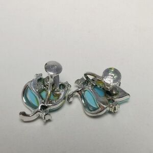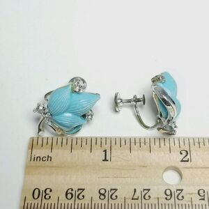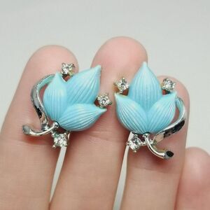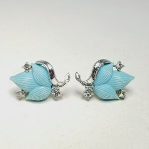 Vintage Lisner Blue Leaf Rhinestone Clip On Screw Back Earrings, Silver Tone
