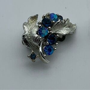Vintage Lisner Blue Rhinestone Clip On Earrings Silver Tone Leaf signed