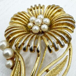 Vintage Lisner Brooch Pin Sunflower Flower Bloom Faux Pearl Gold Tone Estate