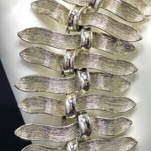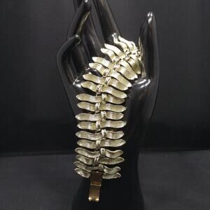 This is a stunning vintage Lisner bracelet from the 1950s featuring a mid-century modern design with articulated links that move gracefully with the motion of your arm. The textured links have a soft gold wash over a silver metal base, while the underside appears rhodium plated for durability and shine. Depending on lighting, the bracelet shifts beautifully between silver and pale gold tones. The Lisner hallmark is clearly stamped on the clasp. This is an elegant and timeless design that showcases Lisner’s signature craftsmanship and would make a perfect addition to any vintage jewelry collection or a thoughtful vintage gift.