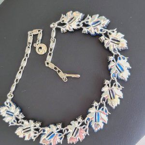 Vintage Lisner Shades of Blue Molded Glass Oak Leaves and Rhinestone Necklace